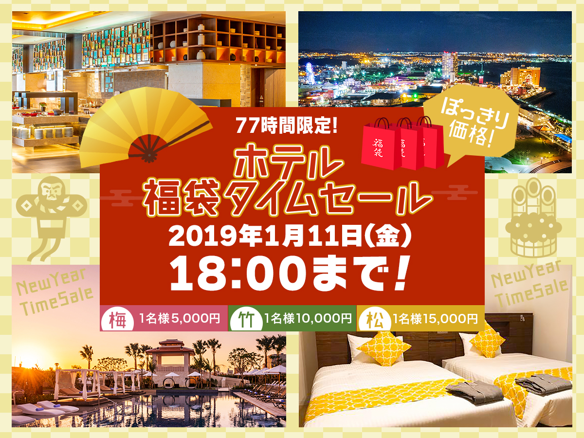 ちゅらとくでは、2019年1月8日(水)13時~1月11日(金)の77時間、会員限定で県内のホテルに特別価格で宿泊できる「ホテル福袋タイムセール」を開催。