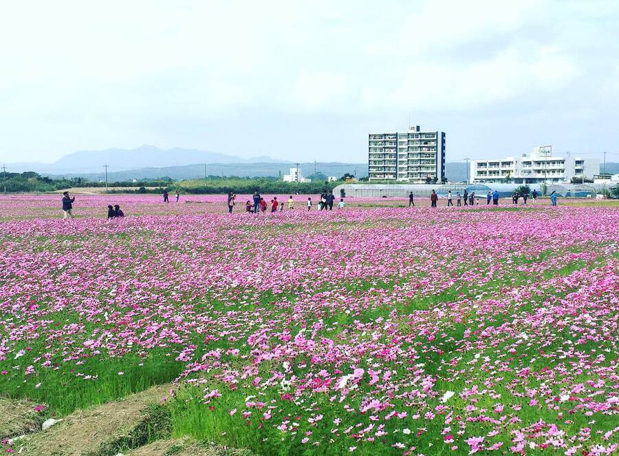 2024年1月現在、名護市羽地の水田にてコスモスを観賞できる。米どころとして知られる羽地の水田では、収穫が終わった約5万坪の広大な土地に、緑肥としてコスモスの種を蒔いているのだ。