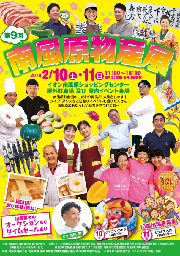 2018年2月10日(土)11日(日)の2日間、イオン南風原ショッピングセンター野外駐車場及び屋内イベント会場にて「第9回 南風原物産展」が開催される。