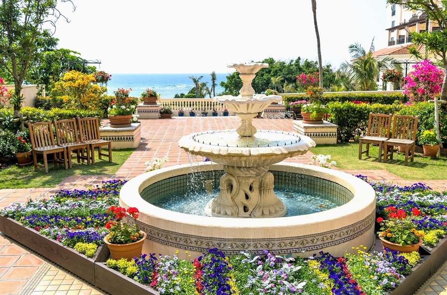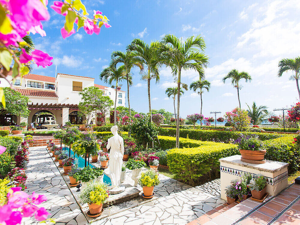 海外にいるような気分で滞在できるホテル日航アリビラ。宿泊やレストラン利用で訪れる際はぜひ、色鮮やかな花に囲まれたくつろぎの中庭(パティオ)にも立ち寄ってみては?