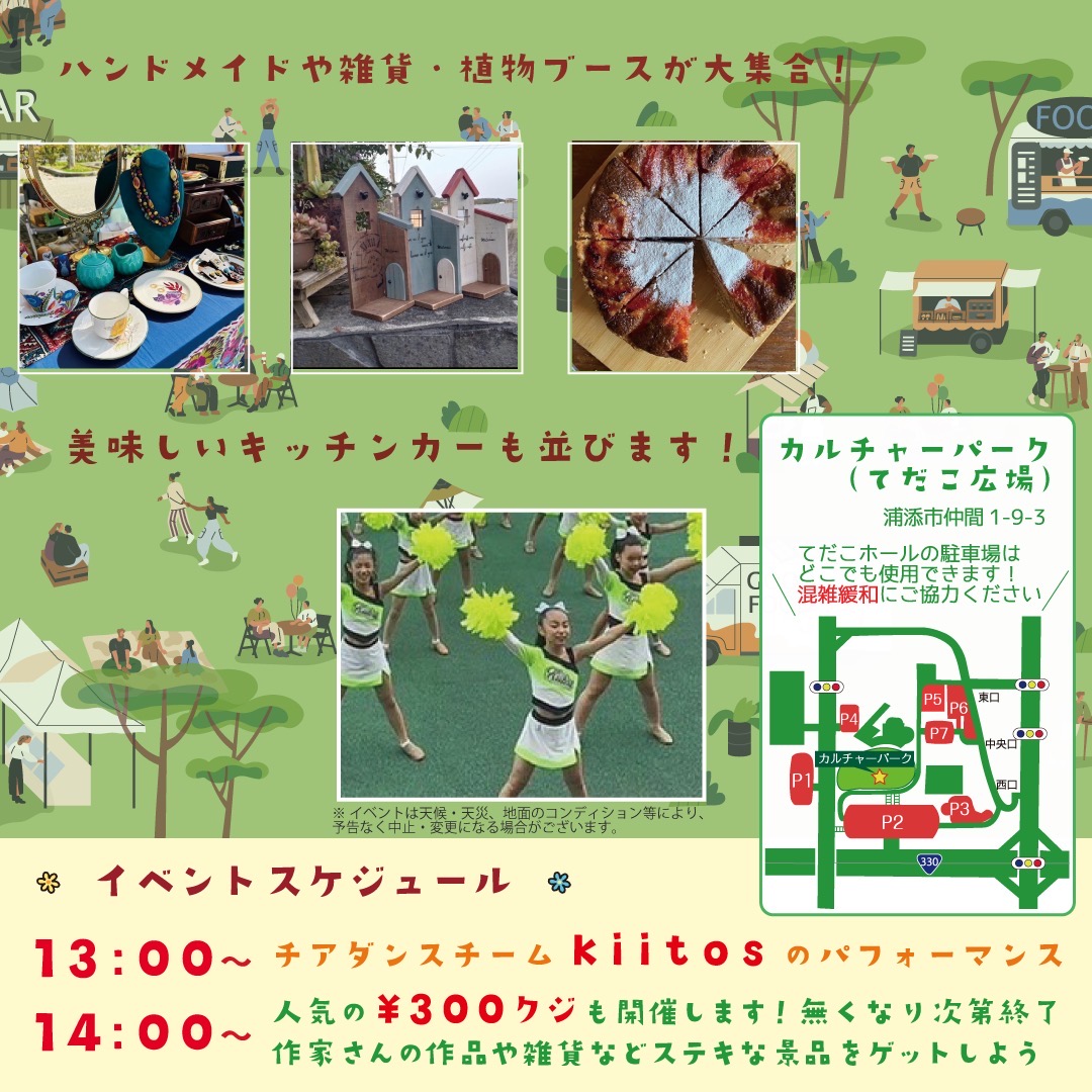 当日は手作り雑貨の作家や海外セレクトショップ、フードブースやキッチンカーなどが約62店が勢揃い。がっつり系の料理からパンやスイーツまで、美味しいものも大集合する。13時からはチアダンスのパフォーマンスもあり。