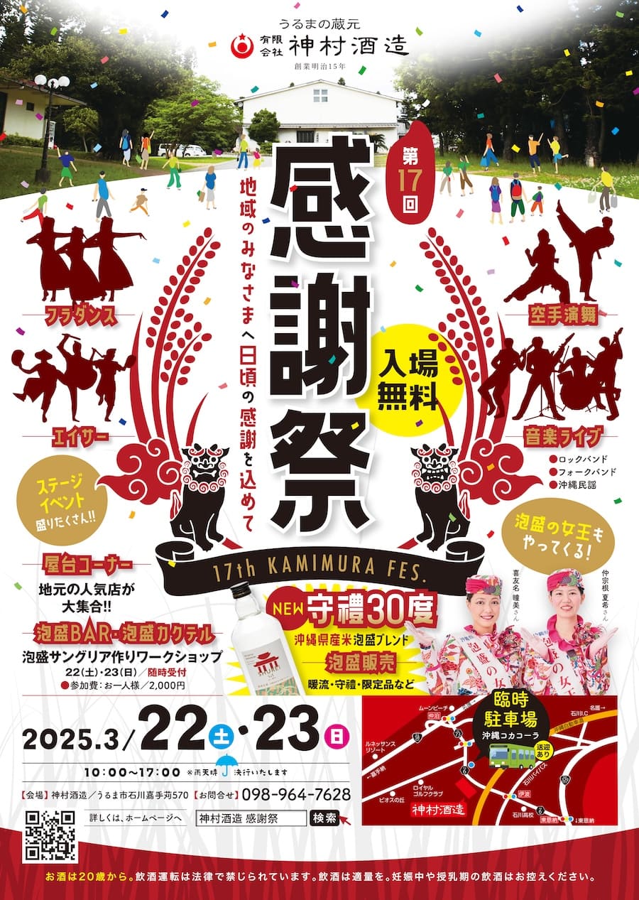 2025年3月22日(土)、23日(日)の2日間、うるま市石川の蔵元「神村酒造」にて「第17回 神村酒造感謝祭」が開催される。