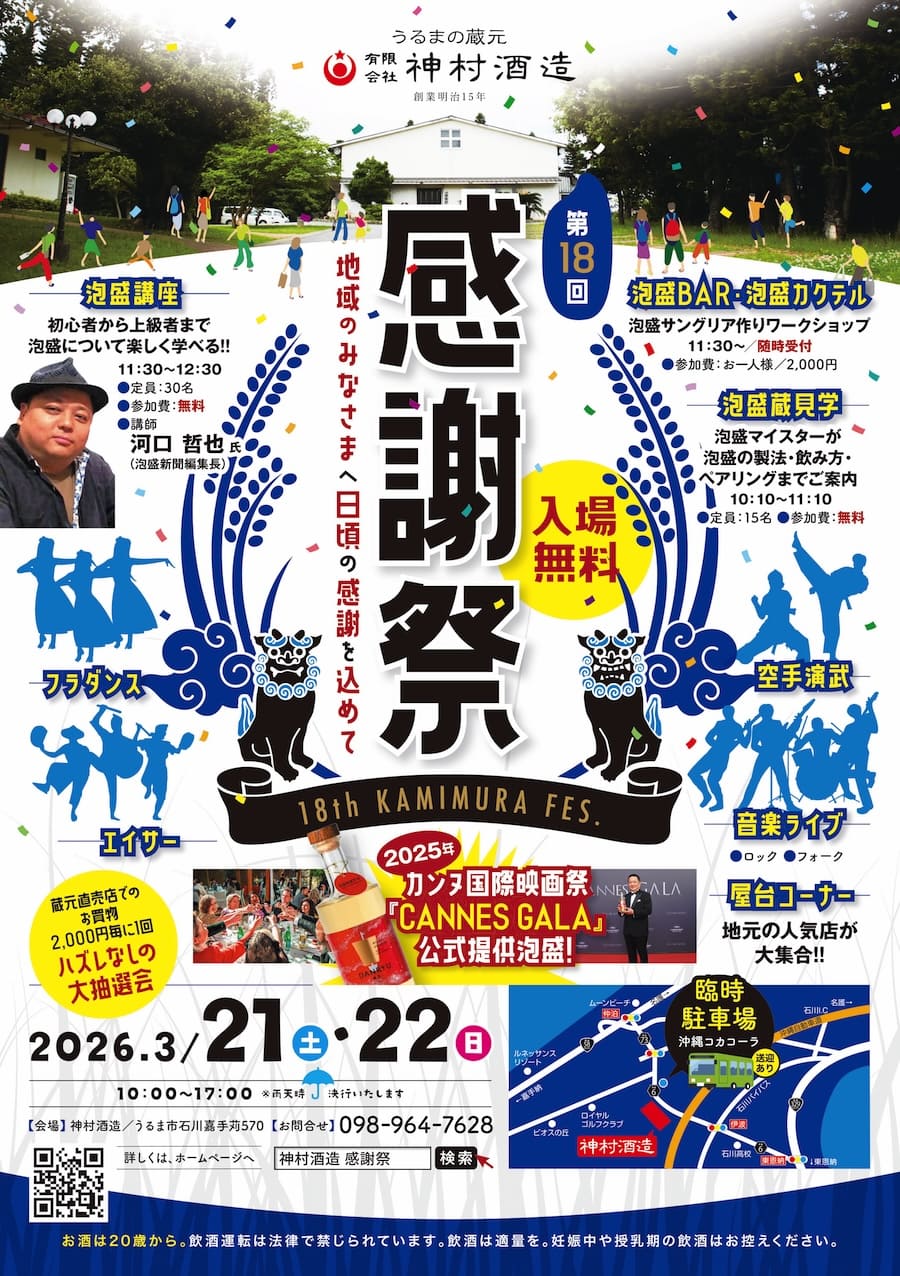 2026年3月21日(土)、22日(日)の2日間、うるま市石川の蔵元「神村酒造」にて「第18回 神村酒造感謝祭」が開催される。