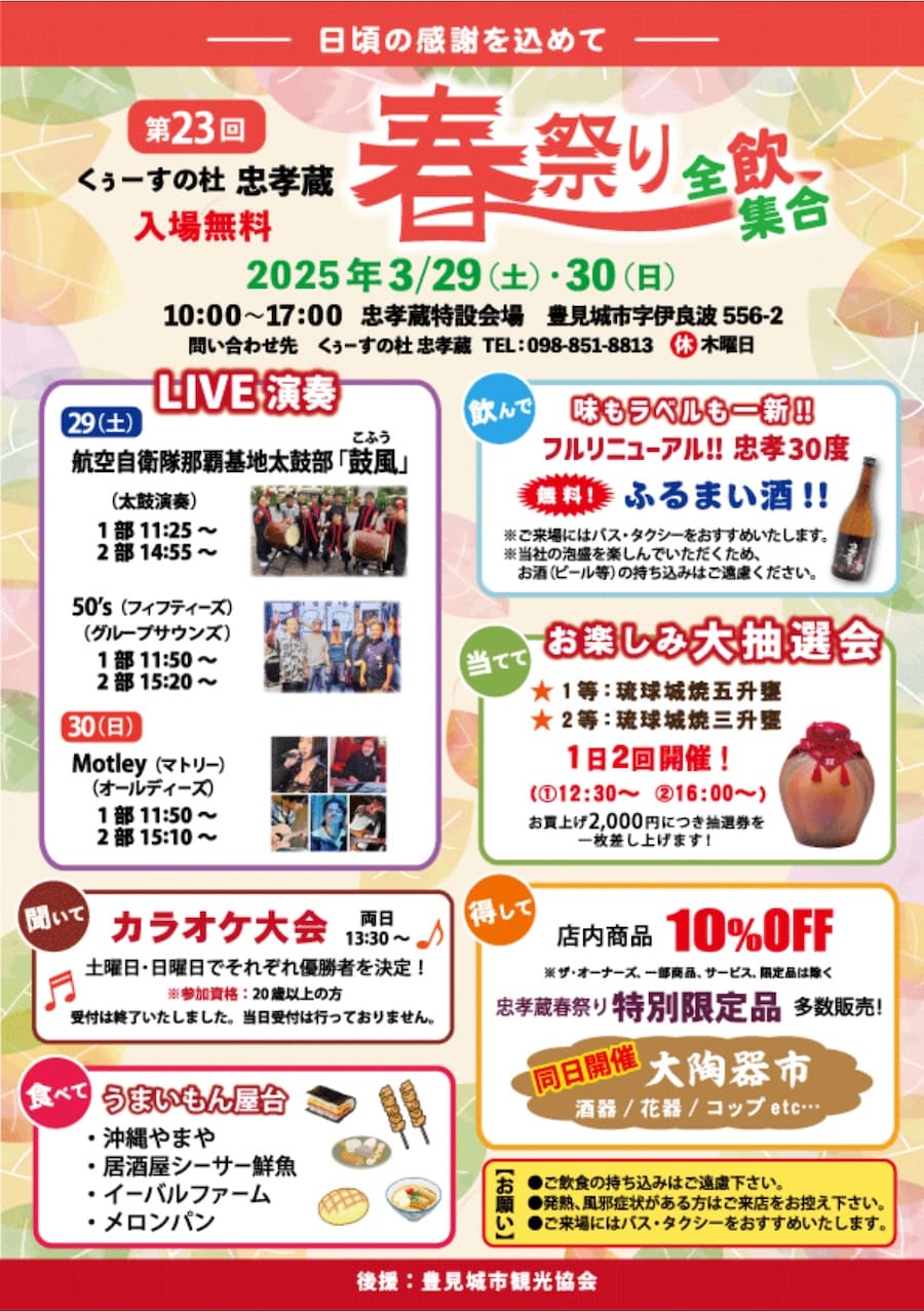 2025年3月29日(土)・30日(日)の2日間にわたり、豊見城市にある「くぅーすの杜 忠孝蔵」で「第23回 くぅーすの杜 忠孝蔵 春祭り」が開催される。