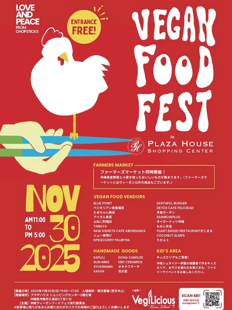 2025年11月30日(日)、沖縄市のプラザハウスショッピングセンターで「沖縄ヴィーガンフードフェス」が開催される。