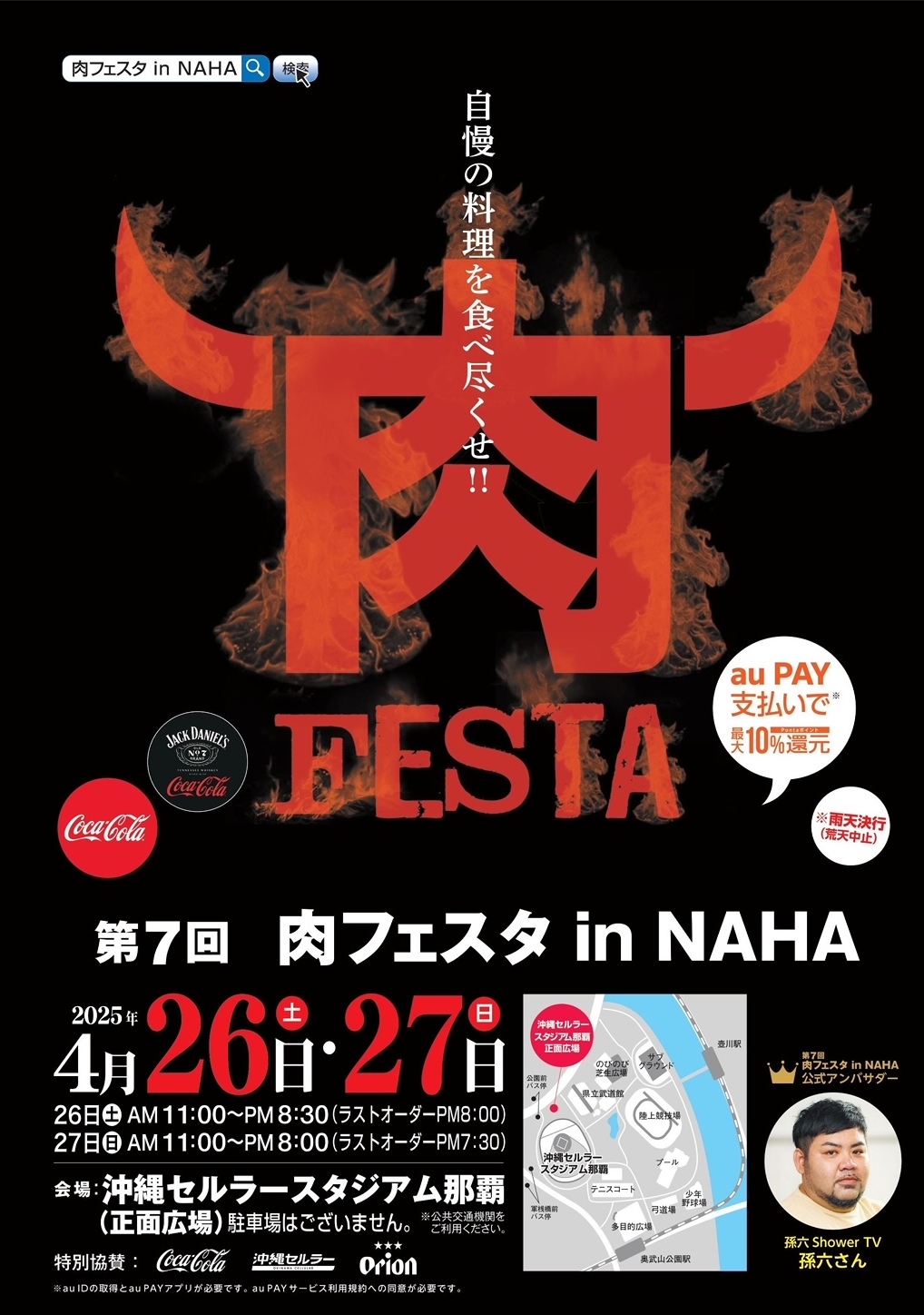 2025年4月26日(土)・27日(日)の2日間、那覇市の沖縄セルラースタジアム那覇正面広場で「第7回 肉フェスタ in NAHA」が開催される。