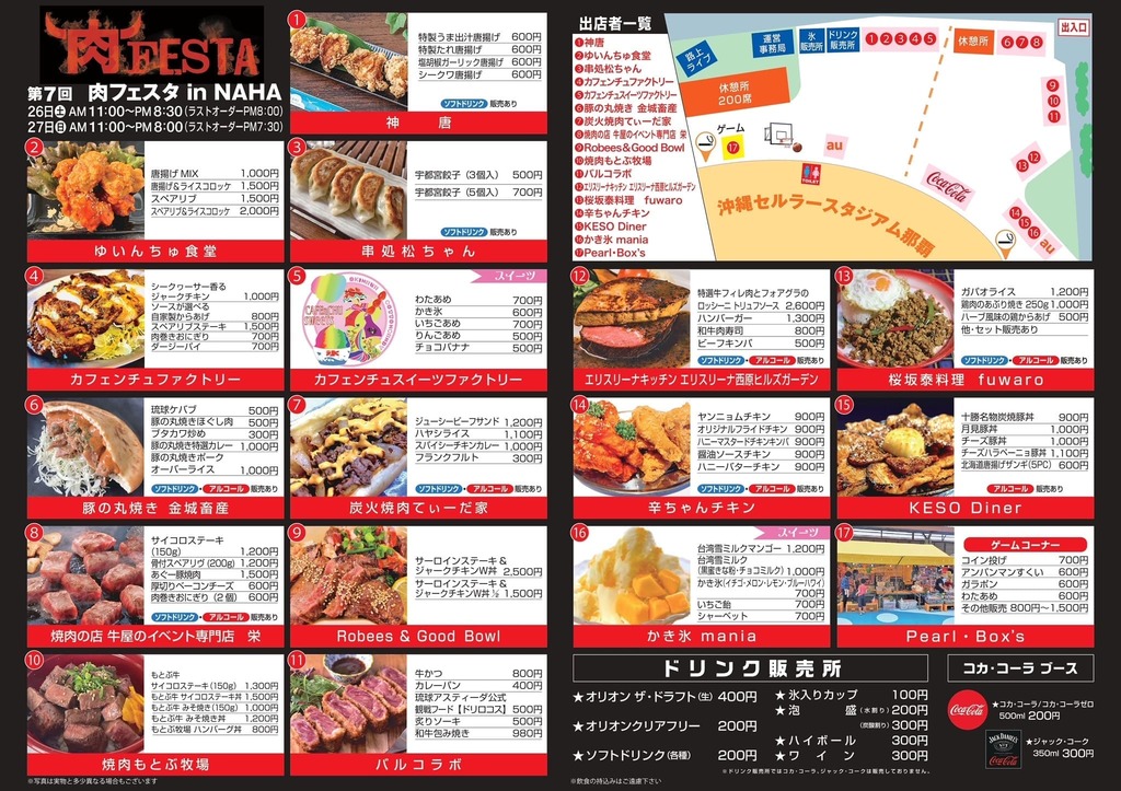 肉好きの肉好きによる肉好きのためのイベント「肉フェスタ in NAHA」。今回の「第7回 肉フェスタ in NAHA」では、美味しいお肉を提供する14の店舗が出店するほか、スイーツのお店が2店舗、ゲームコーナーが1店舗出店する。