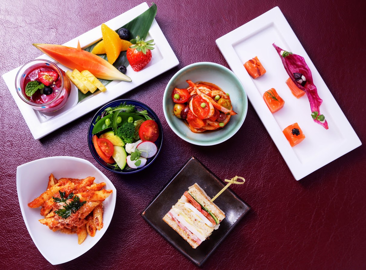 プールが一望できる広々とした空間が人気のラウンジで、サラダや前菜、サンドウィッチ、ペンネ、デザートなどが彩り鮮やかに並べられたオリジナルプレートを堪能できる。また、追加料金でノンアルコールスパークリングやケーキの演出も可能。