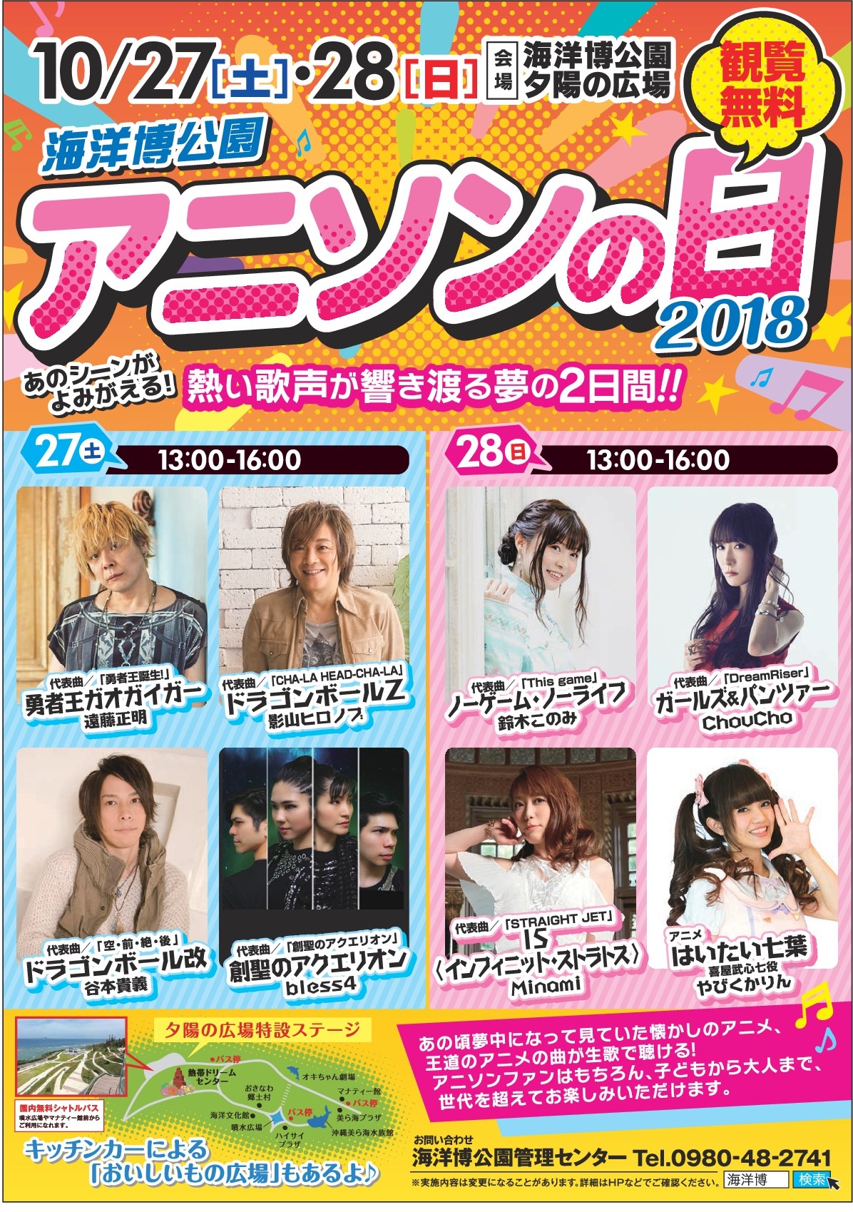 沖縄県本部町にある「海洋博公園」で、アニメソング歌手によるライブイベント「海洋博公園アニソンの日2018」が、10月27日(土)、28日(日)の2日間開催される。