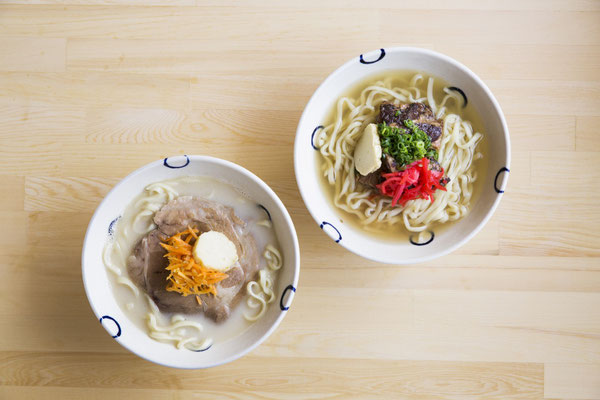 スープは2種類。伝統的な沖縄そばのスープの元味(650円)と、同じ食材を使いながら、出汁の取り方の違いにより仕上げられた白湯スープの真味(680円)。この真味にはニンジンのナムルが添えられている。具は、肩ロースとソーキと厚揚げの3種類。