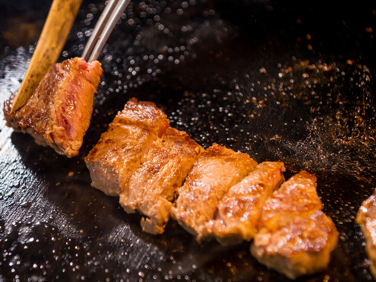 ブッフェコーナーとステーキ専用カウンターとが分かれており、ステーキはその場で焼いてくれるので熱々のまま味わえるのが人気の理由。牛肉はもちろん鶏肉や豚肉も用意され、ステーキ専門店と変わらない肉の味を存分に堪能できる。
