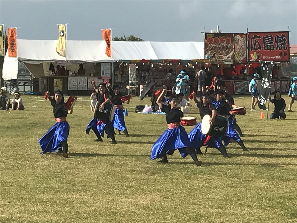 毎年多くの子ども達が参加するこのお祭りは、各々の団体がこの日のために渾身を込めたエイサーを躍動感いっぱいに披露する。昨年は全体で約12団体が出演し、その内の2団体は豊見城市青年連合会から出演で、同市内の若者が中心になり大太鼓や旗頭を掲げて沖縄伝統のエイサーを披露。舞踊や空手などとも競演し、おまつり会場を大いに盛り上げてくれた。