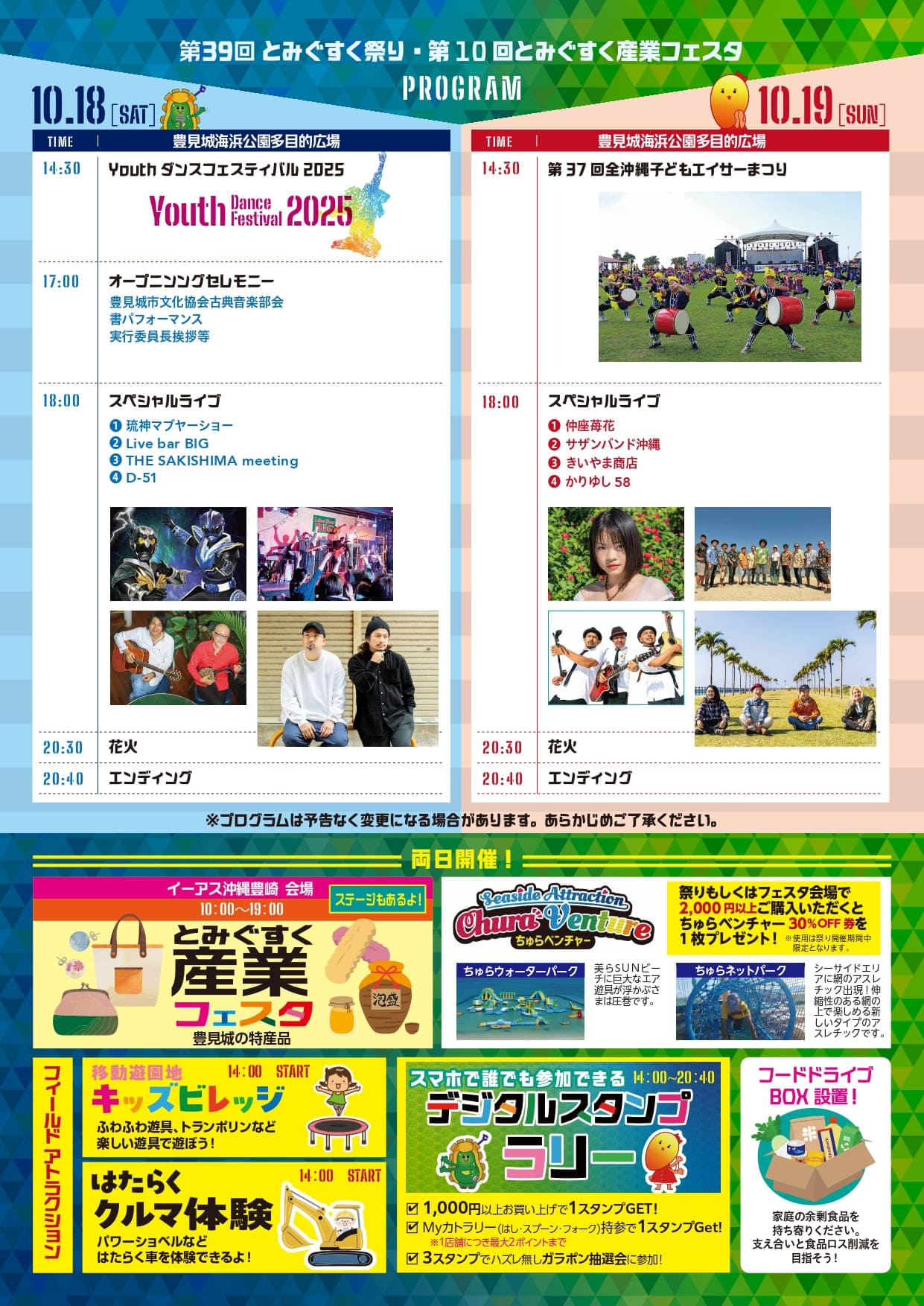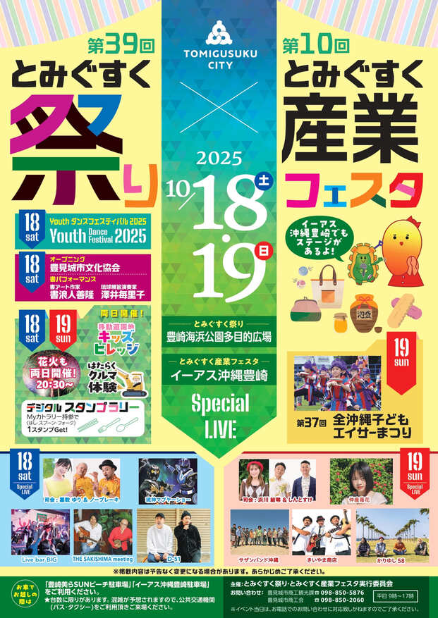 2025年10月18日(土)・19日(日)の2日間、豊見城市の豊崎海浜公園多目的広場とイーアス沖縄豊崎で「第39回 とみぐすく祭り・第10回 とみぐすく産業フェスタ」が開催される。