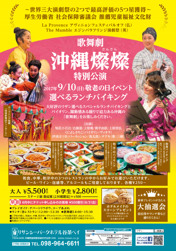 リザンシーパークホテル谷茶ベイのランチブッフェを味わった後は、「歌舞劇 沖縄燦燦」の特別公演を楽しむ事が出来る敬老の日のプレゼントにぴったりのイベントだ。