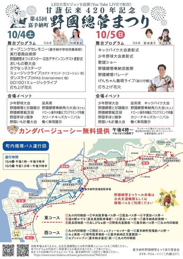 さらに、「第45回 野國總管まつり」の会場内でアンケートに答えた方は、両日ともに16時からカンダバージューシーをプレゼント。先着約200名なので、時間のチェックを忘れずに。