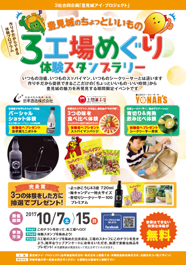 2017年10月7日(土)~15日(日)の期間中、店舗兼工場をもつ3メーカーによる特別体験イベント「~豊見城ちょっといいもの~ 3工場めぐり 体験スタンプラリー」が開催される。
