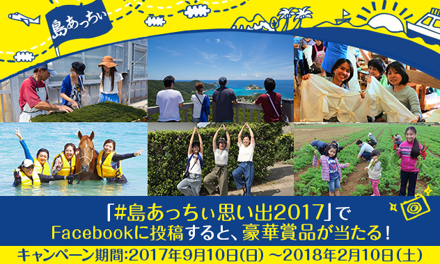 2017年9月10日(日)~2018年2月10日(土)の期間中、島あっちぃ体験で撮影した写真をFacebookに投稿すると、抽選で離島特産品などが当たる「フォトコンテスト」を開催。★好評につき期間延長!2018年3月1日(木)まで