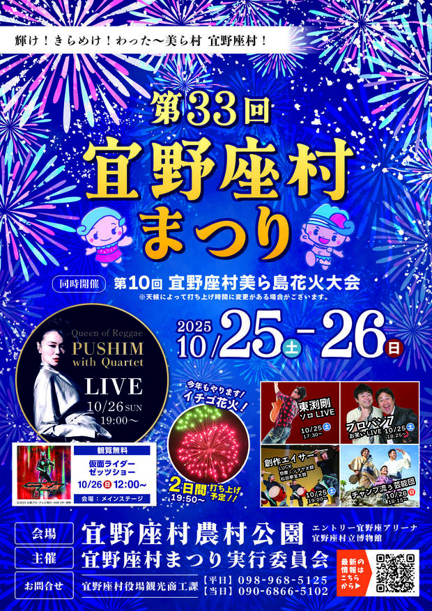 2025年10月25日(土)・26日(日)の2日間、宜野座村の宜野座村農村公園を中心に、「第33回 宜野座村まつり&第10回 美ら島花火大会」が開催される。