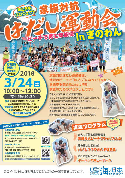 2018年3月24日(土)、宜野湾市のトロピーカルビーチで「家族対抗はだし運動会inぎのわん」が開催される。