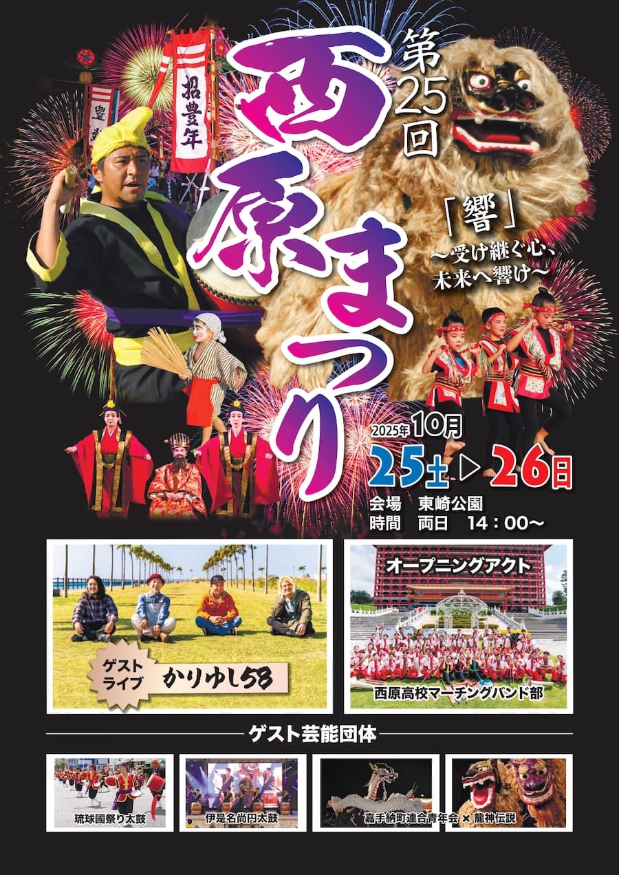 2025年10月25日(土)・10月26日(日)の2日間、西原町の東崎公園にて「第25回 西原まつり」が開催される。地域の伝統・文化の継承や活性化を目的としたイベントで、エイサーや琉舞、創作太鼓などのステージを楽しめる。