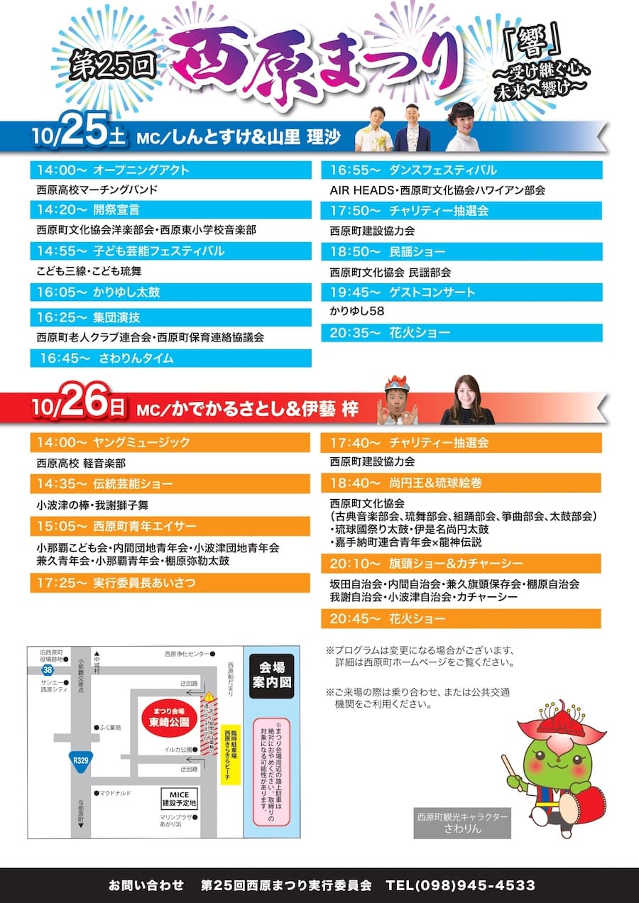 10月25日(土)は、西原高校マーチングバンドのオープニングアクトに始まり、ダンスフェスティバルや、かりゆし58のライブなど盛り上がること間違いなしのプログラム。