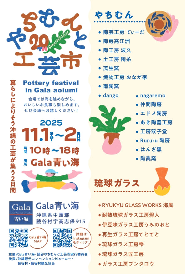 2025年11月1日(土)・2日(日)の2日間、読谷村のGala 青い海で「第20回 読谷やちむんと工芸市」が開催。お手頃な価格で作家から直接やちむんを購入できるとあって、毎年多くの人が足を運ぶ人気のイベントだ。