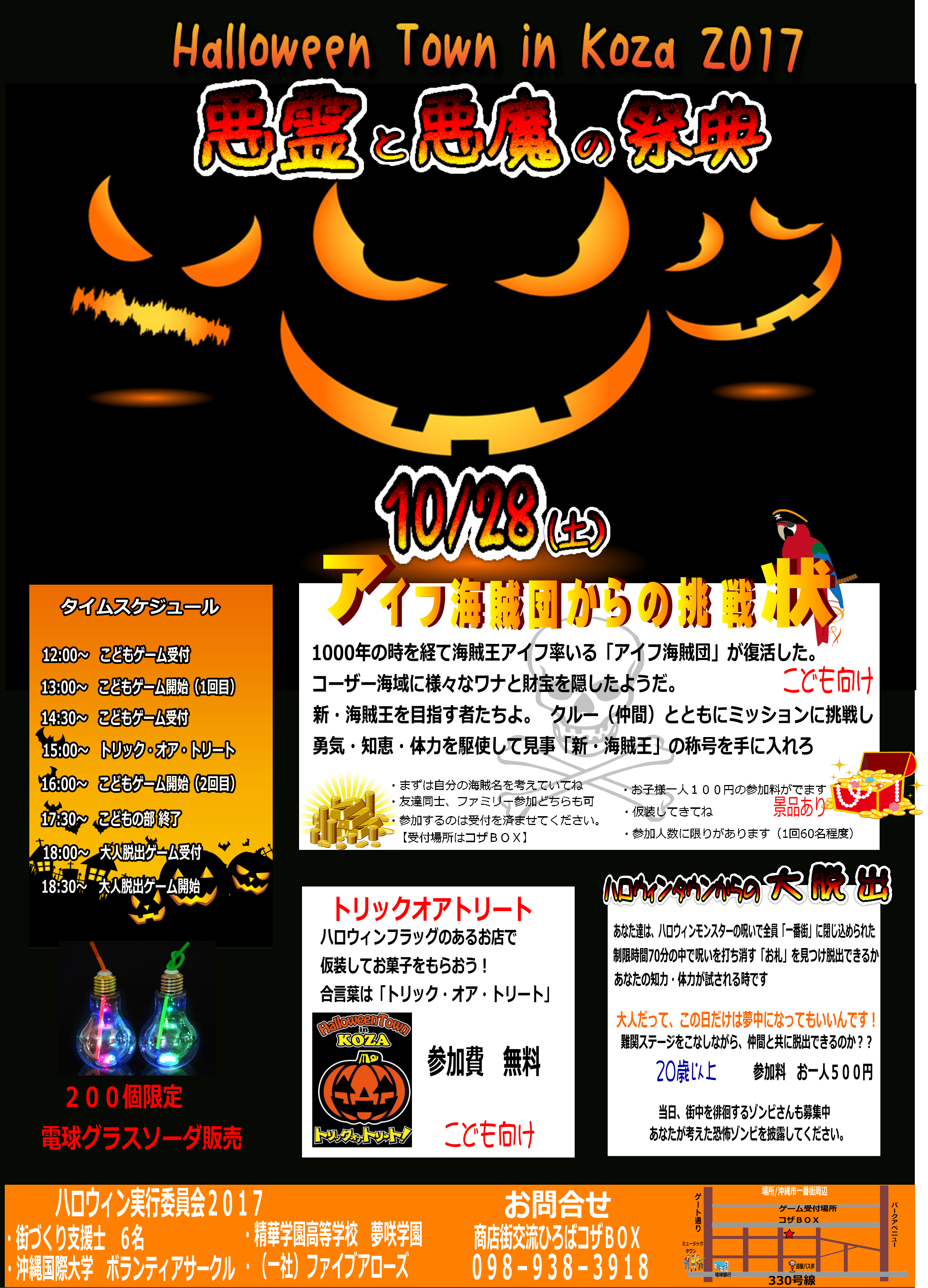 2017年10月28日(土)、沖縄市コザBOXで、「ハロウィンタウンinコザ 悪霊と悪魔の祭典」が開催される。イベントは小さな子どもから大人まで楽しめるイベントとなっており、子ども向け・大人向けのゲームが用意されている。