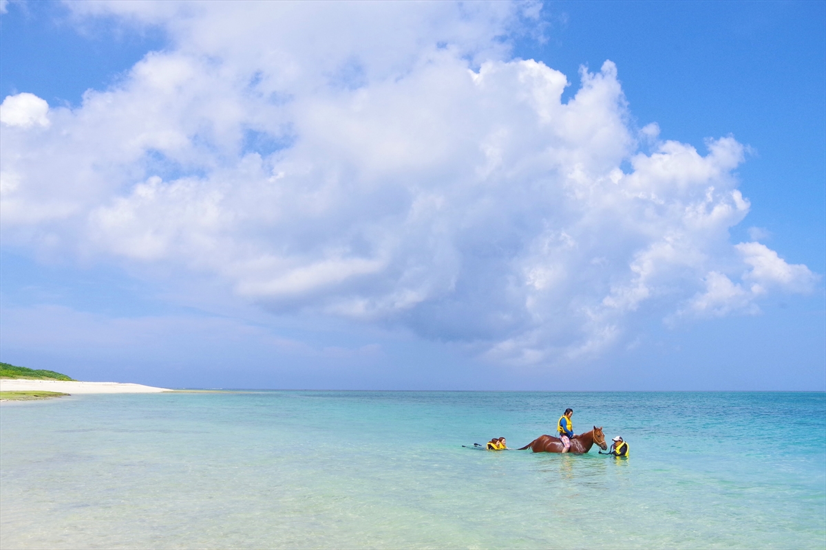 腹ごしらえを済ませたら、次は「伊江島ビーチサイドホースパーク」へ。着替えを済ませると、伊江島の美しい海に馬と一緒に入り、海遊びを楽しむことができる。