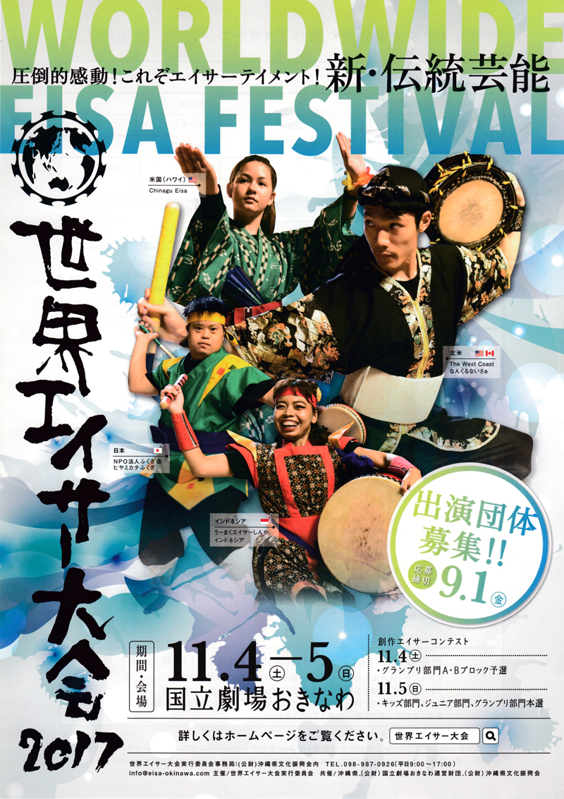 2017年11月4日(土)と5日(日)の2日間、浦添市の国立劇場おきなわにて、「世界エイサー大会2017」が開催される。