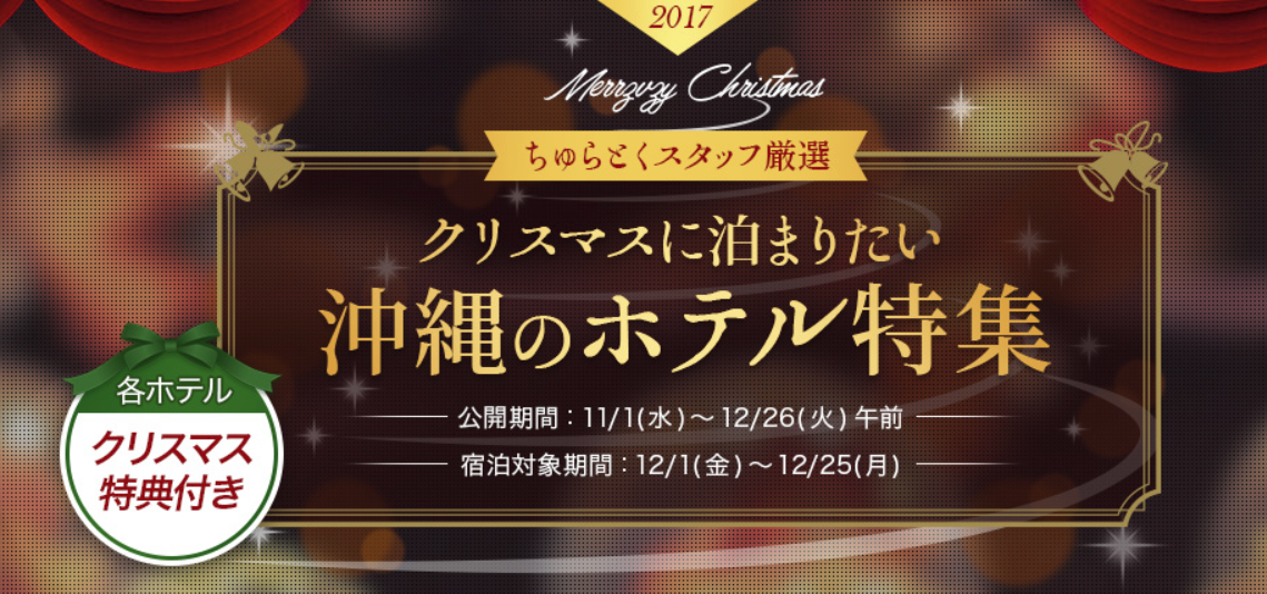 また、ちゅらとく会員様17万人突破を記念して、特集期間中にクリスマスプランを予約した方の中から抽選で2名様に、人気ホテルのペア宿泊券が当たるプレゼントキャンペーンも実施。