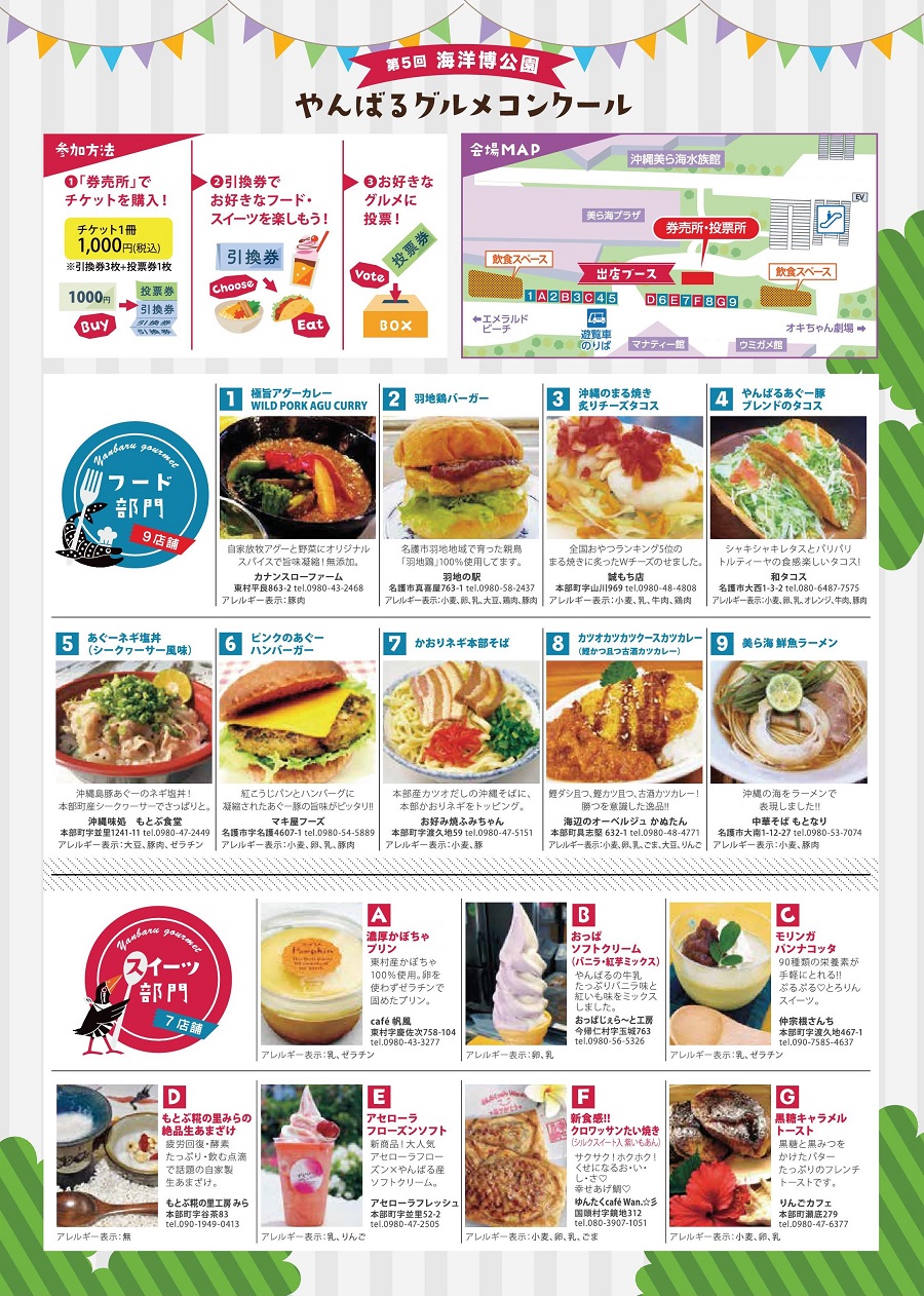 沖縄本島北部地域(やんばる)のおいしい店舗が勢ぞろいし、それぞれの味を競う毎年人気の食のイベント。今年も「カンナスローファーム」や「沖縄味処 もとぶ食堂」、「アセローラフレッシュ」、「りんごカフェ」など、有名店のイチオシを堪能できる。