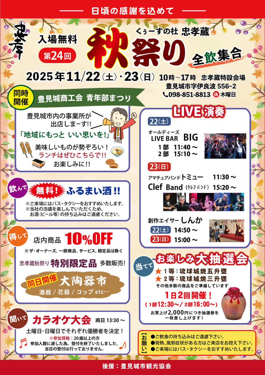 2025年11月22日(土)・23日(日・祝)の2日間、豊見城市にあるくぅーすの杜 忠孝蔵にて「第23回 秋祭り」が開催される。