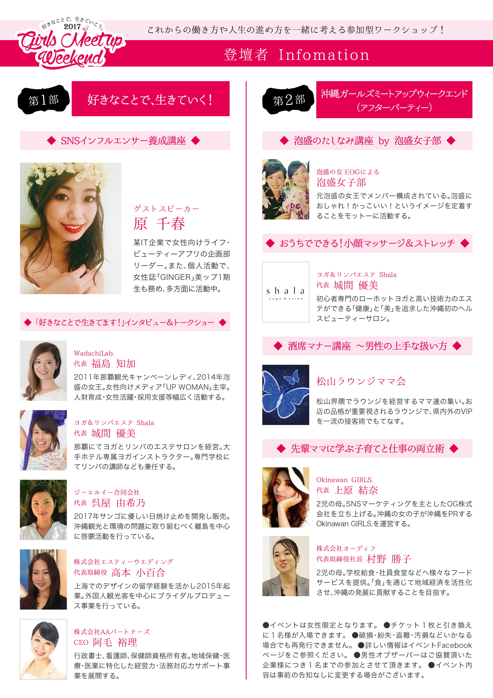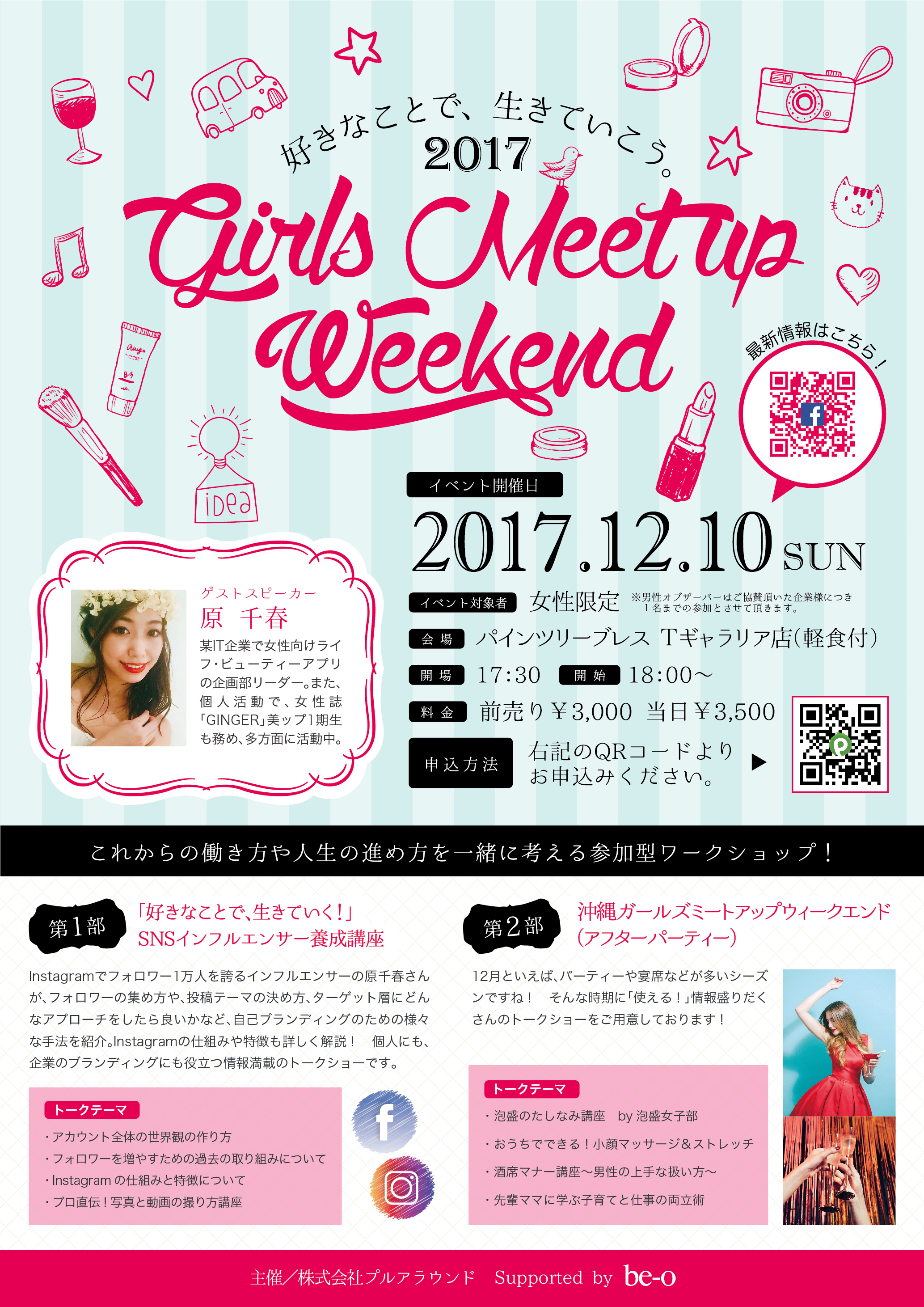 「好きなことで、生きていこう。」をキーワードに、沖縄の女性に向けてこれからの働き方や人生の進め方を一緒に考える、参加型の女性限定ワークショップイベント「Girls Meet up Weekend」が2017年12月10日(日)那覇市にある「パインツリーブレス Tギャラリア店」で開催される。