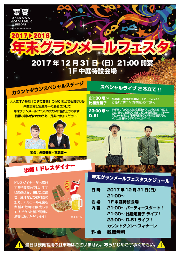 2017年12月31日(日)、沖縄市の「オキナワ グランメールリゾート」では、毎年恒例の「2017→2018年末グランメールフェスタ」を今年も開催する。