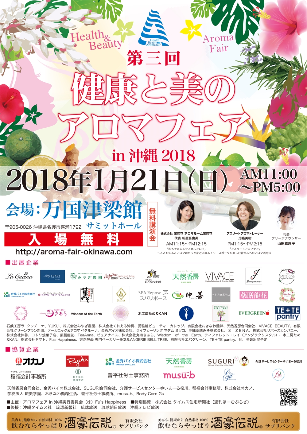 沖縄県名護市にある「万国津梁館」サミットホールにて、「第三回健康と美のアロマフェアin沖縄2018」が2018年1月21日(日)に開催される。
