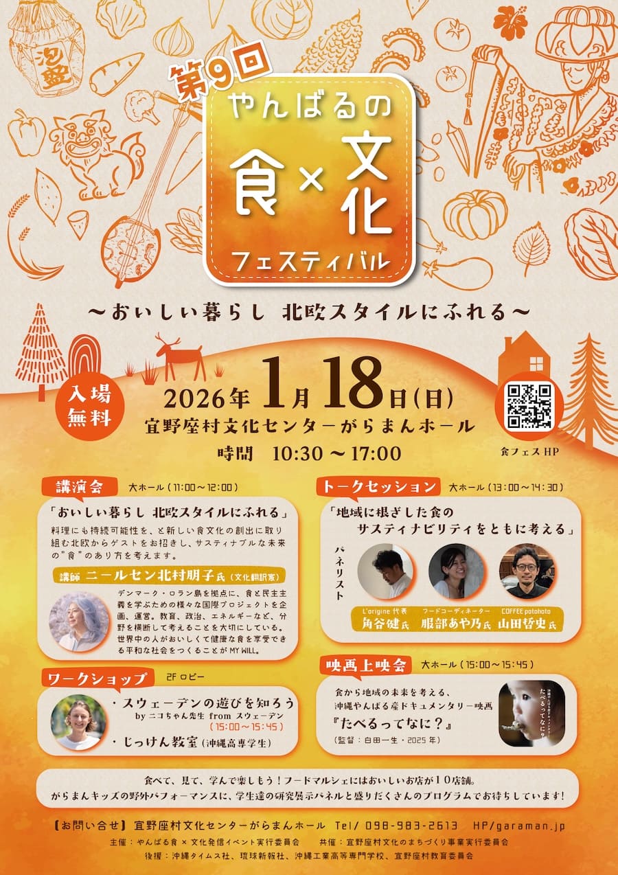 沖縄県北部「やんばる」の食と文化の歴史、そしてさまざまな国や地域とのつながりを「見て・聞いて・味わう」体感イベント「第9回 やんばる食×文化フェスティバル」が宜野座村文化センターがらまんホールで、2026年1月18日(土)に開催される。