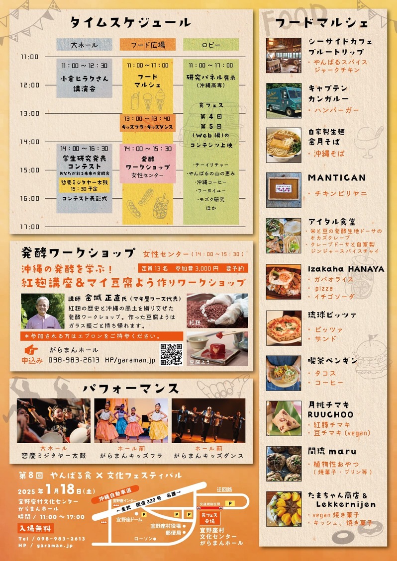 沖縄県北部「やんばる」の食と文化の歴史、そしてさまざまな国や地域とのつながりを「見て・聞いて・味わう」体感イベント「第8回 やんばる食×文化フェスティバル」が宜野座村文化センターがらまんホールで、2025年1月18日(土)に開催される。