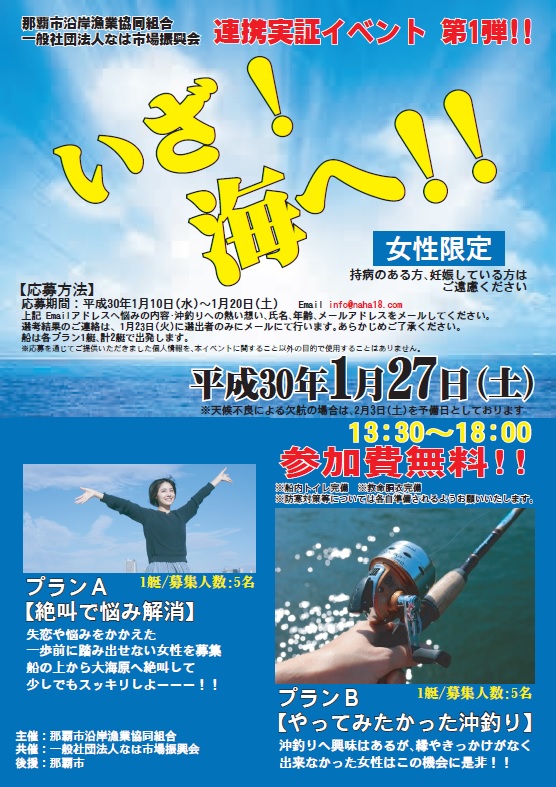 2018年1月27日(土)、那覇市沿岸漁において、女性限定の沖釣り体験、船上から悩みを叫ぶイベント「いざ!海へ!!」が開催される。