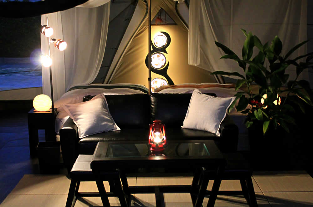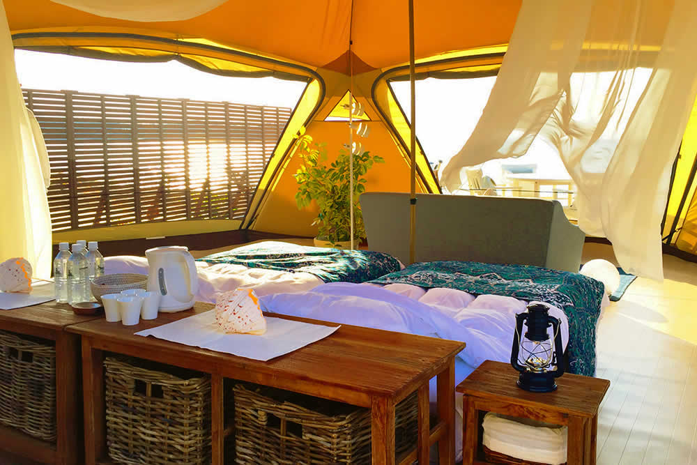 テントも3種類から選ぶことができ、エーゲ海を思わせる青を基調とした「ビーチスタイル」、アジアの風を感じさせる天然素材が心地よい「バリスタイル」、沖縄伝統の琉球畳が心を癒す「琉球スタイル」の3つ。