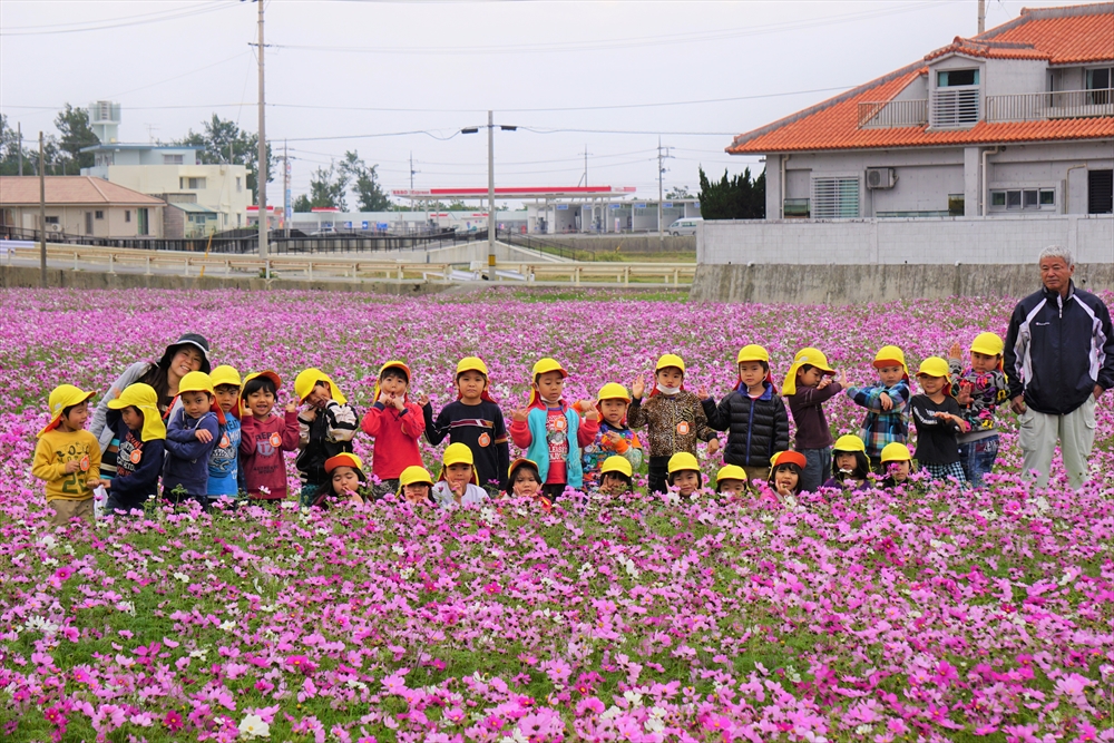 2019年2月1日 (金)~2019年2月24日 (日)、沖縄県金武町伊芸地区集会所前の田んぼで、コスモスが咲き誇る。