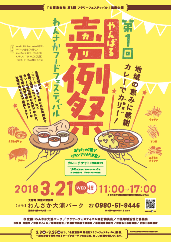 2018年3月21日(水・祝日)、名護市東海岸にある「わんさか大浦パーク」にて、わんさかフードフェスティバル「第1回 やんばるカリー祭」が開催される。