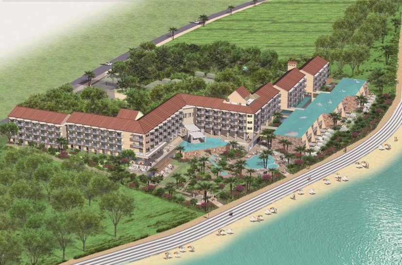 建設予定地は、大宜味村塩屋の「結の浜」。埋め立て地で、海のすぐそばに位置する。地上4階と地下1階で、客室は200室。レストランや大浴場、プールなどの施設が備えられる予定だ。