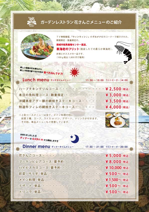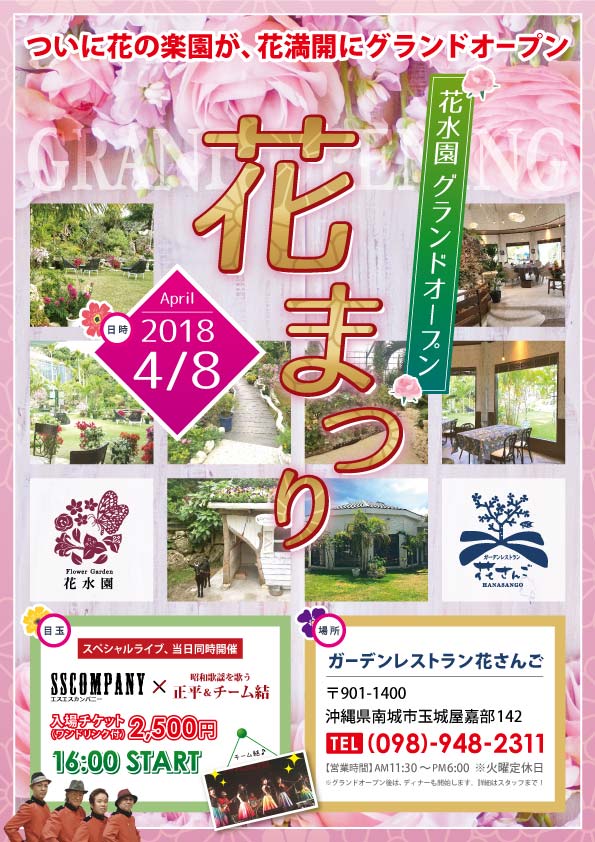 南城市玉城にある株式会社花水園、その中にあるガーデンレストラン「花さんご」が2018年4月8日(日)グランドオープンを迎える。