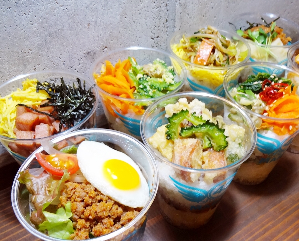 「タコライス」や「人参シリシリ&ゴーヤーチャンプルー」、「沖縄ちゃんぽん」など、県民に愛されている定番の家庭料理をカップに詰め込んだ「カップライス」を販売している。