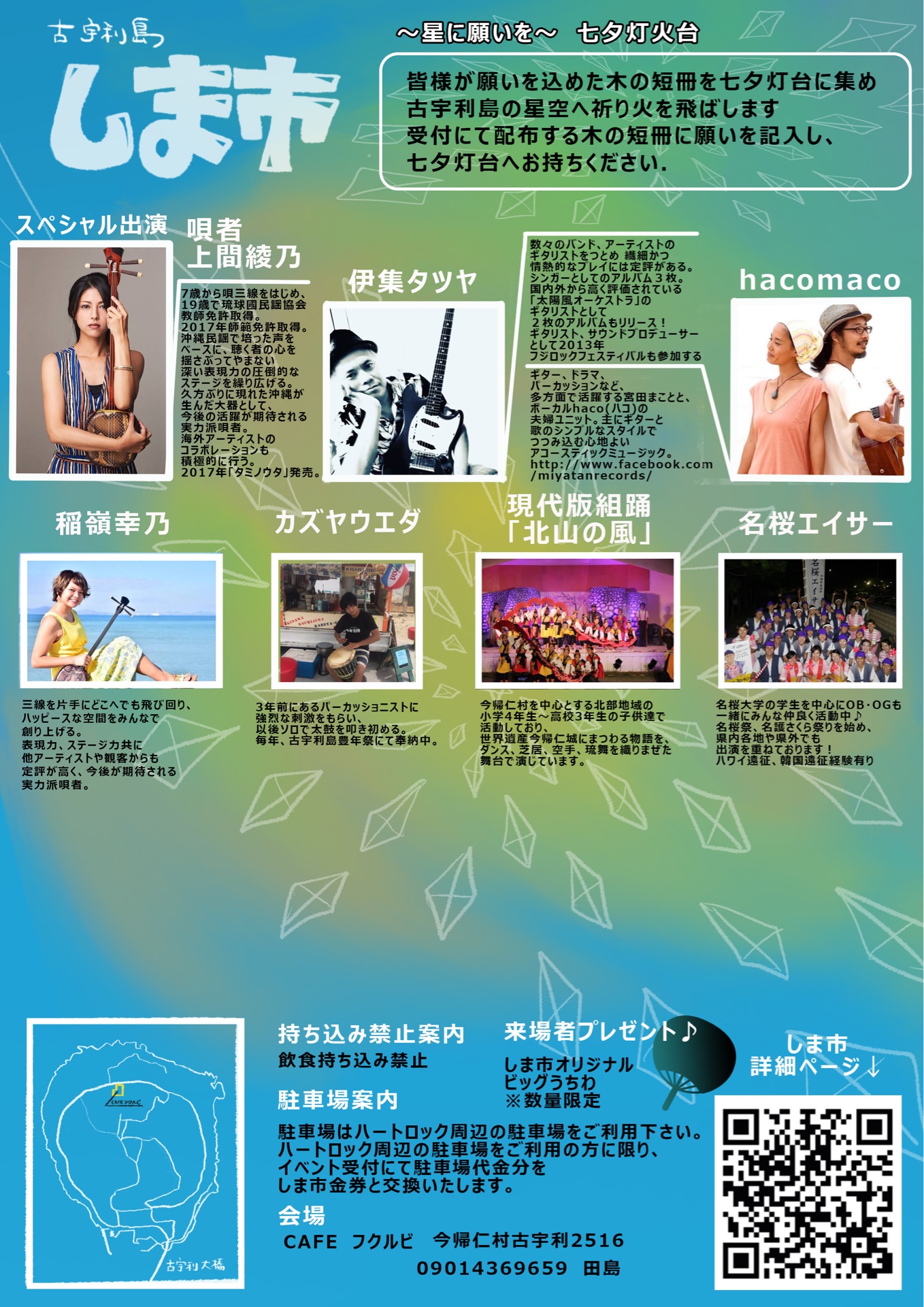 本市では、県産野菜を使ったフードや県内の人気雑貨店が出店。ライブステージやグルメイベント、参加型ゲーム等が行なわれる。また、名桜大学のエイサーや今帰仁村を中心とする北部地域の小学4年生から高校3年生の子供たちの現代版組踊「北山の風」、ひまわり迷路畑や花火など盛りだくさん。