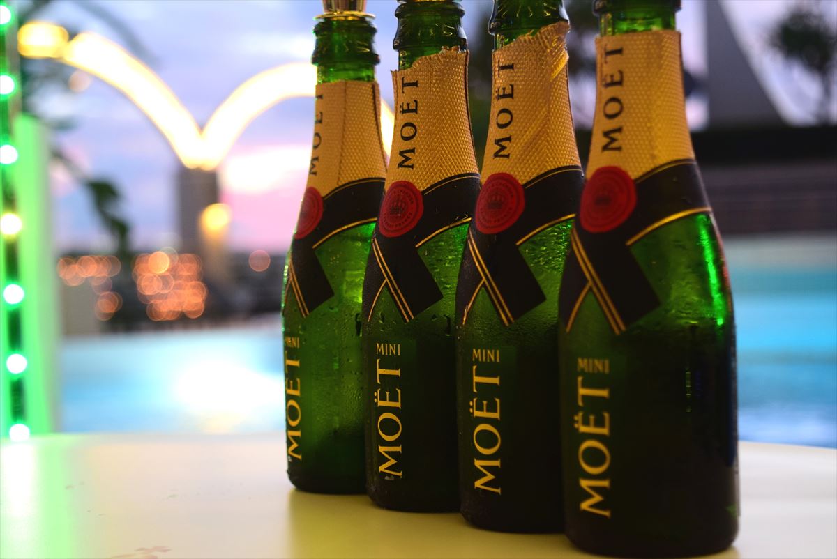 DJのクラブ音楽をバックに、人気のシャンパンメーカー「MOET & CHANDON」と食事を楽しむナイトプールイベント。入場料金を支払うと、オードブル&モエ・エ・シャンドンミニボトル1本がついてくる。