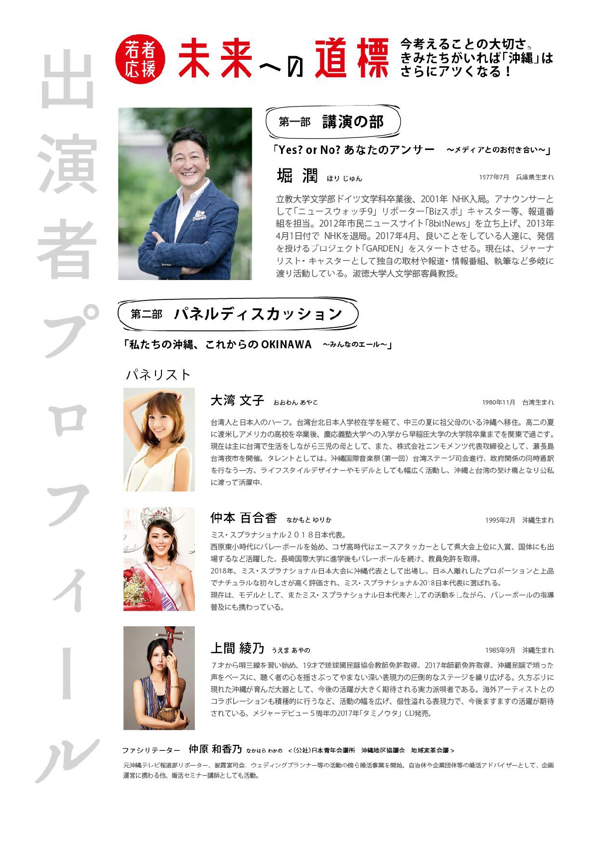 第二部では、ライフスタイルデザイナーやモデルとしても幅広く活躍、沖縄と台湾の架け橋として活躍する大湾文子氏とミス・スプラナショナル2018年日本代表の中本百合香氏、メジャーデビュー5周年の実力派唄者である上間綾乃氏などの出演者がパネルディスカッションを行う。