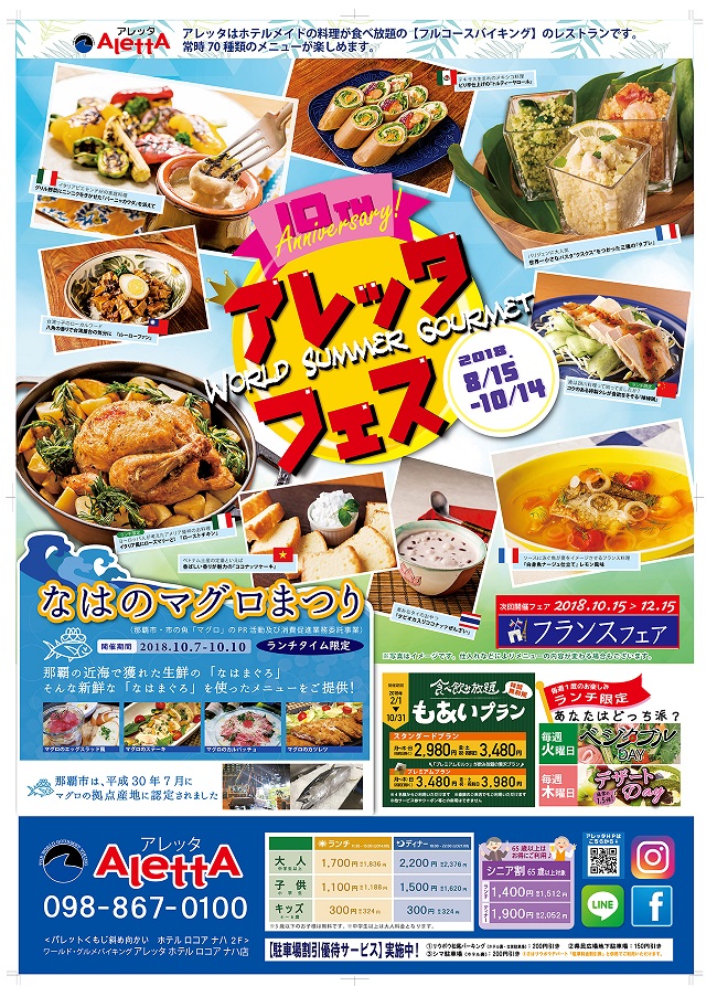 10月10日の「まぐろの日」に合わせて、10月7日(日)~10月10日(水)の4日間、那覇市内にあるホテルロコアナハ2Fレストランアレッタにて、「なはまぐろ」を使ったランチフェアが開催される。