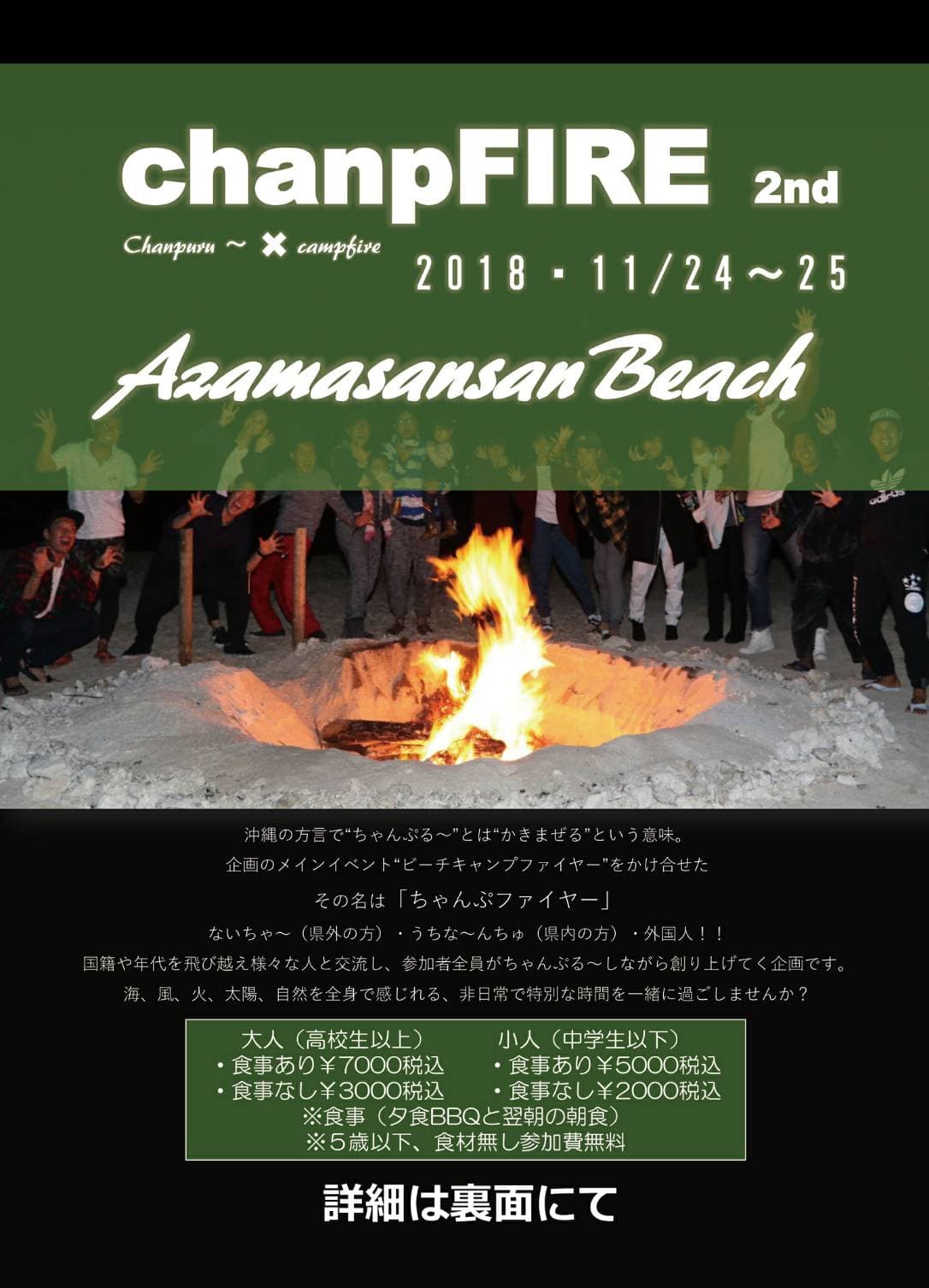 2018年11月24日(土)~25日(日)にあざまサンサンビーチでchanpFIRE 2nd(ちゃんぷファイヤー)が開催。