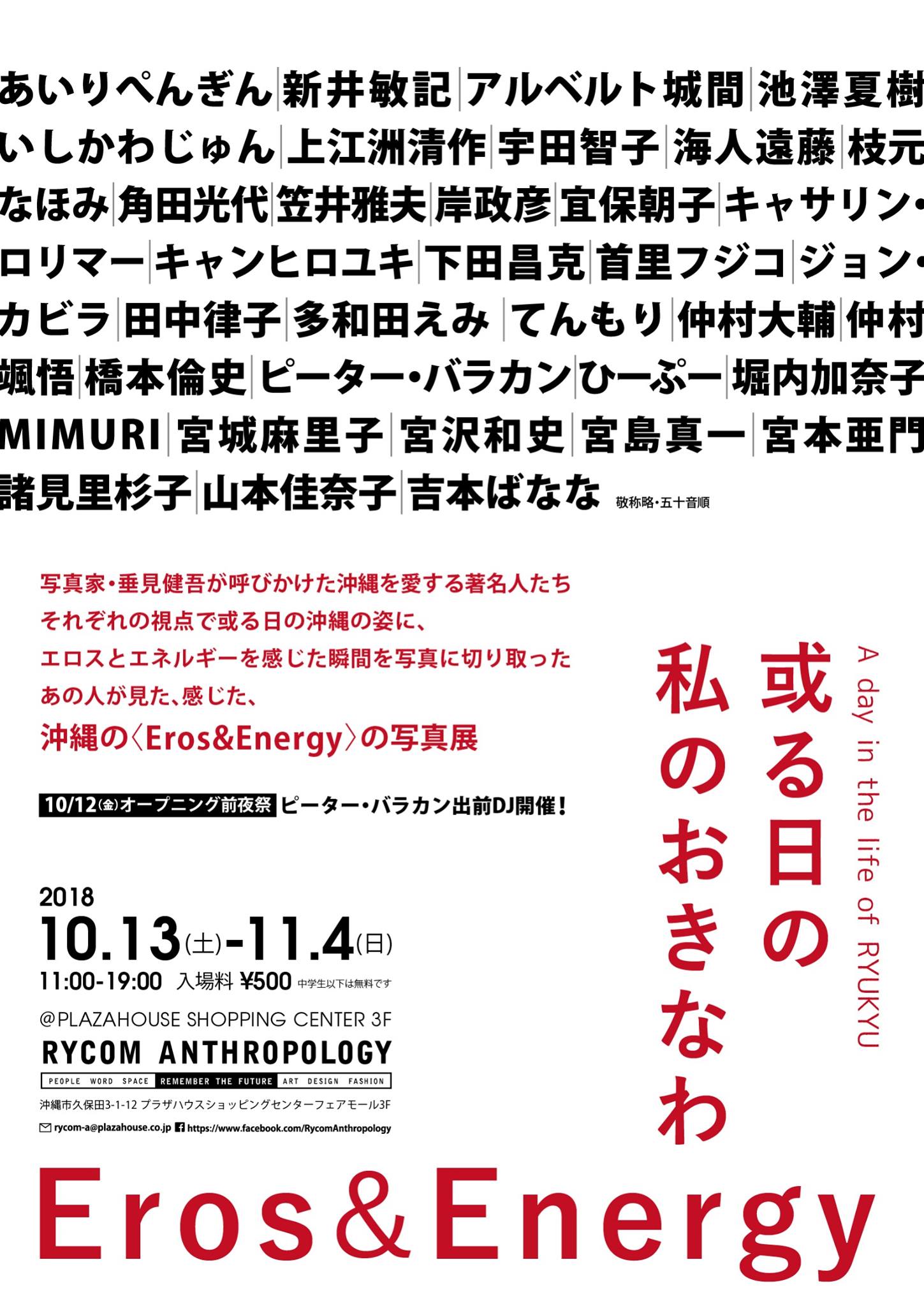 昨年好評を博した写真展「或る日の私のおきなわ」が、今年さらにパワーアップした形で開催される。今回は、テーマ「Eros&Energy」とし、沖縄を拠点に活動する写真家・垂見健吾が、アルベルト城間や、角田光代、ジョン・カビラ、多和田えみなど沖縄を愛する著名人、総勢35名に呼びかけ実現したもの。オープニングイベントには、ラジオDJ、音楽評論家など幅広く活躍するピーター・バラカンが登場。プラザハウス・ライカムアンソロポロジーへ出前DJする。